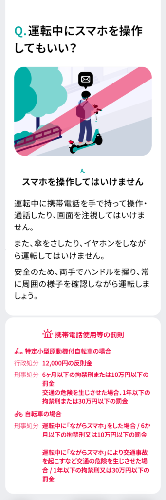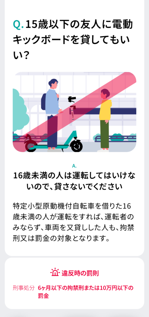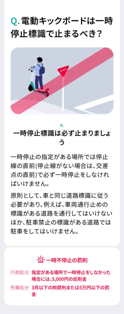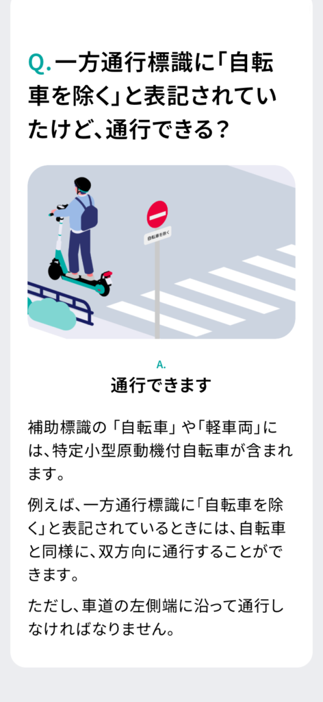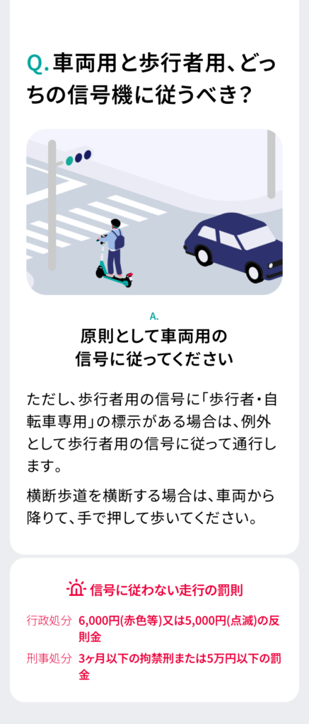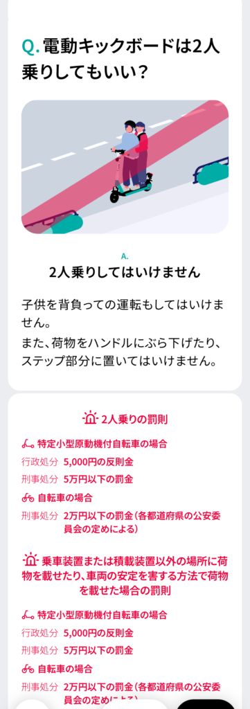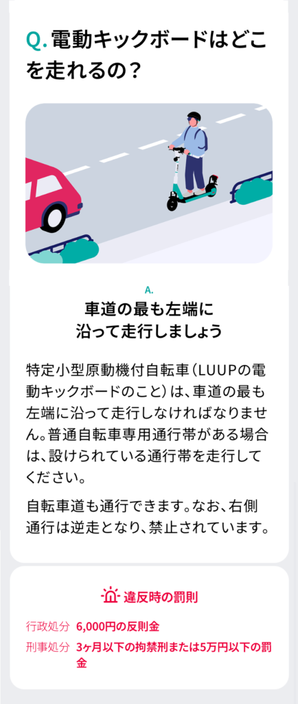 など、LUUP公式アプリの「交通ルールテスト(予習編)」を元に、電動キックボードの乗り方を調べてみました。