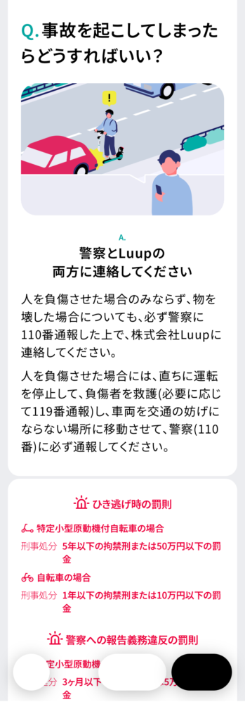 - 事故の場合は、警察とLUUPの両方に連絡しよう。