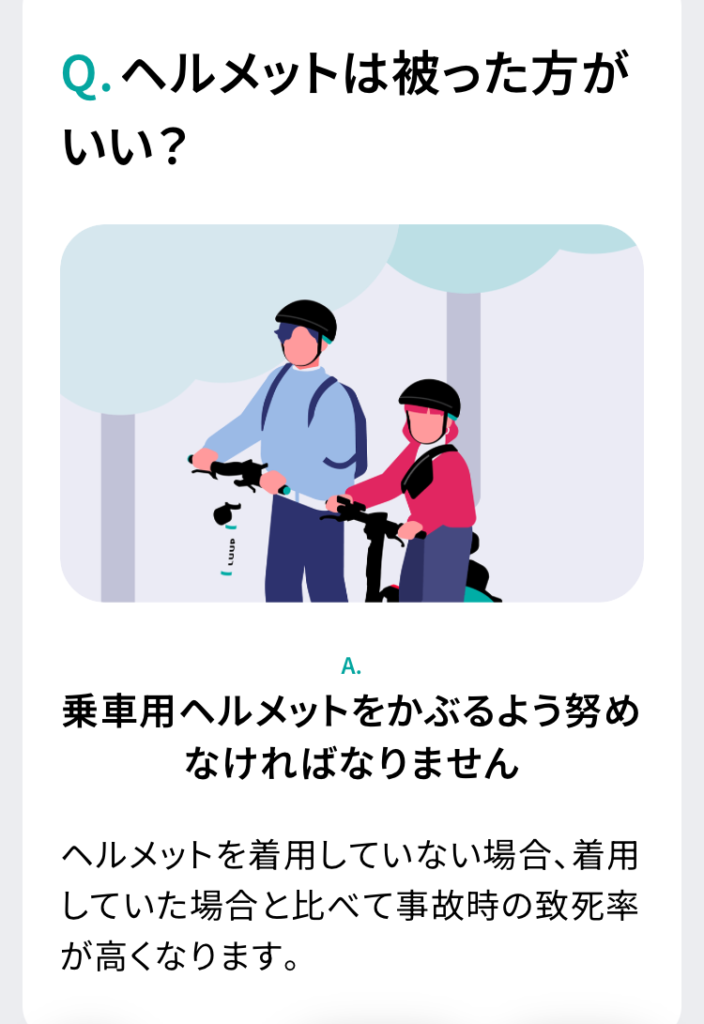 - LUUP利用に際してはアプリ内で、交通ルールテストに満点合格し、年齢確認書類を提出する必要があります。(運転免許証、パスポート、在留カード、マイナンバーカードなど)